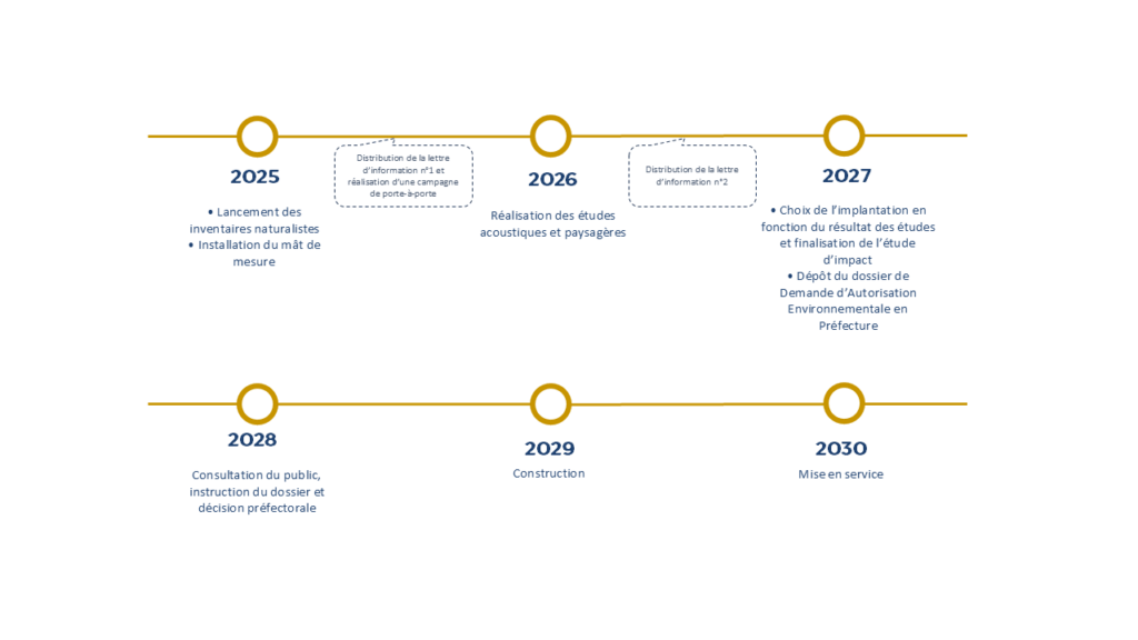 En moyenne, 5 à 8 ans s’écoulent entre l’identification d’un site favorable et l’obtention des autorisations administratives délivrées par le préfet. Cette période, qui correspond à la phase de développement du projet, est jalonnée de nombreuses étapes. L’objectif est d’adapter au mieux le projet au territoire d’accueil, à son environnement et au paysage, en lien avec les élus locaux et les habitants.